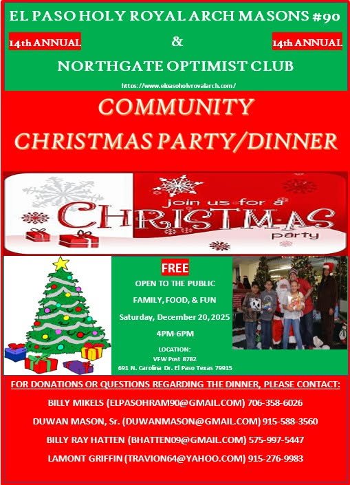 On 19 November 2022 El Paso Holy Royal Arch held its Annual Thanksgiving Dinner at 6331 Alabama St in El Paso Texas. Thanks to all the supporters and donors that made this event a success. Also, a special thanks to PHP Mason, EHP Berard, PHP Mikels, and PHP Smith for stepping up and making things happen. This year the chapter provided 152 meals for veterans, and about an additional 250 for community members of El Paso.